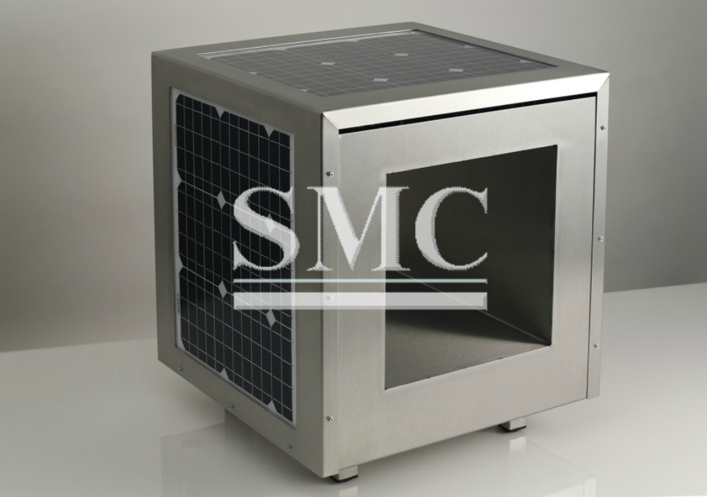 The water Cube is a 20-inch cube of stainless steel with solar cells embedded within that power a refrigeration device. The device cools an inverted cone to create condensation, which then dribbled into a glass to provide water. Pictures on the Sun Glacier website show how the technology operates.